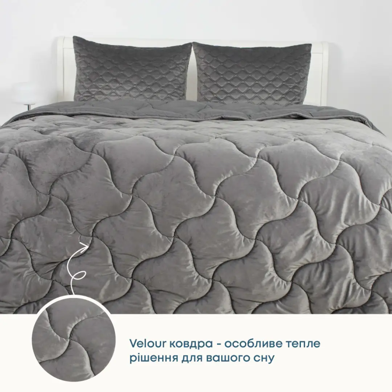 Загорніться в неперевершений комфорт та відчуйте ніжність з ковдрою ТЕП "VELOUR" у елегантному темно-сірому кольорі. Ця ковдра стане вашим улюбленим компаньйоном для спокійного сну та затишних вечорів.