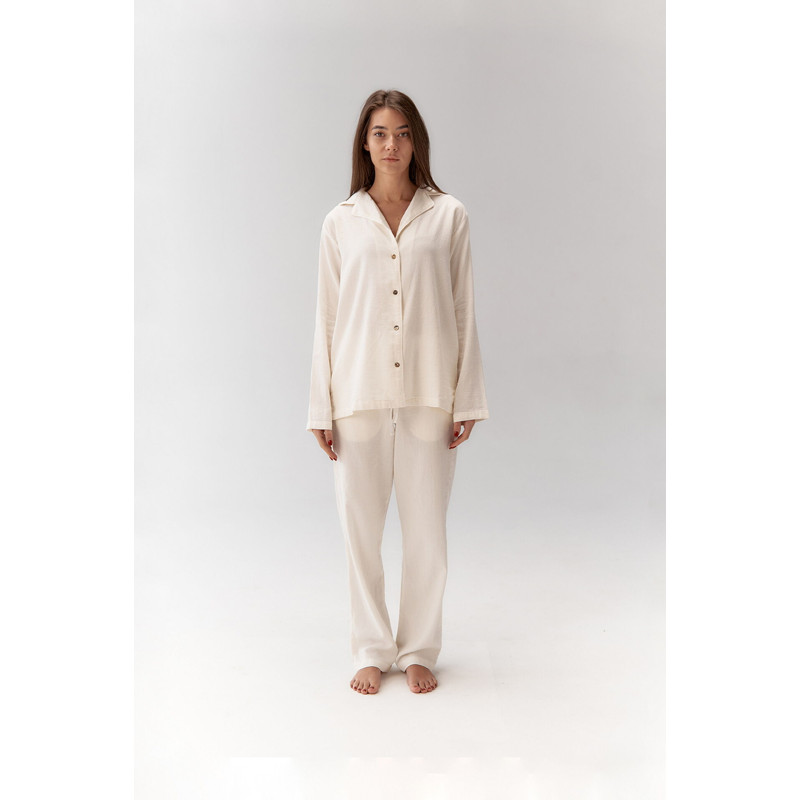 Сорочка на ґудзиках, має двобортний комір та бічні нижні розрізи. Штани прямого крою з резинкою та утяжками на талії, виріб має дві бічні кишені.
