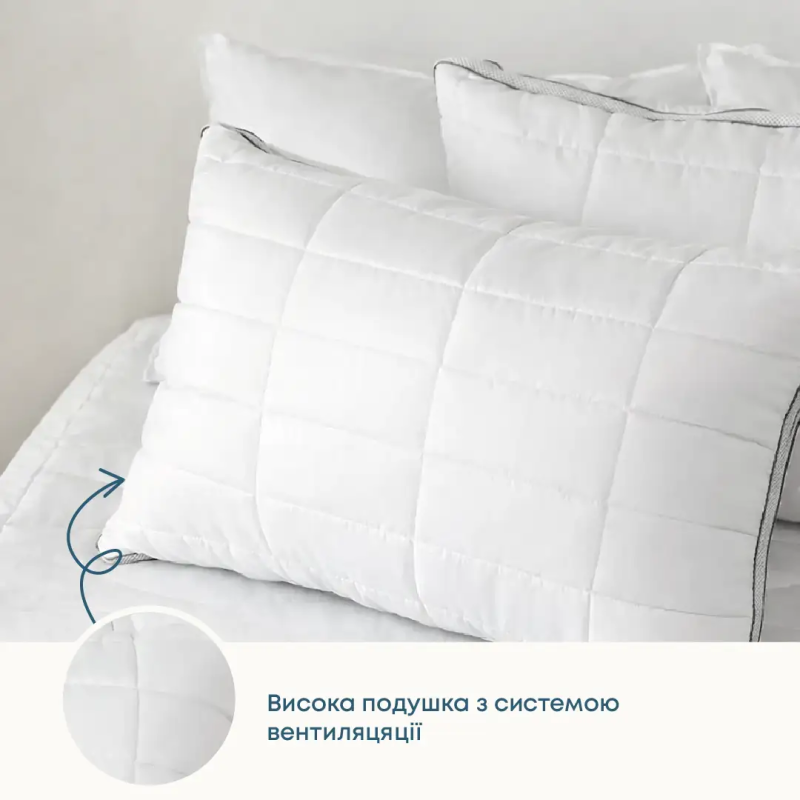 - Оптимальна підтримка: Подушка забезпечує правильне положення голови та шиї, зменшуючи напруження м'язів та сприяючи здоровому сну.
